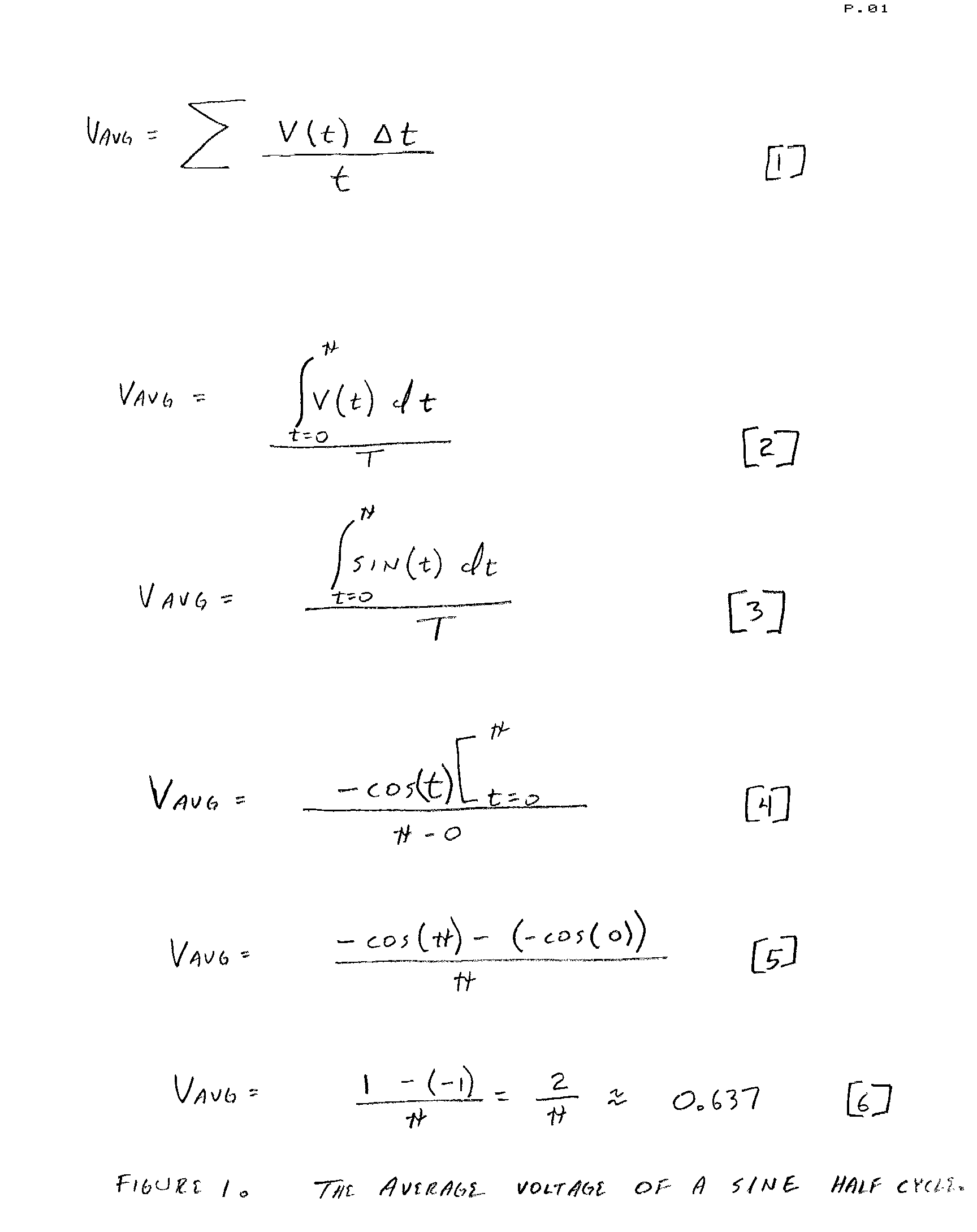 For a more exact determination of the average voltage of a half cycle, let's reconsider how we determine the average. If, for example, you travel 10 miles per hour for 1 hour and 20 miles per hour for two hours, you might be tempted to say the average speed is 15 miles per hour (add the speeds and divide by the number of speeds). However, we know that what we must really do is determine the total distance traveled (10 miles + 40 miles), then divide by 3 hours, yielding 16.667 miles per hour. Our new definition of average is the sum of the products of the value times the amount of time we spent at that value, divided by the total time. Applying this to the voltages in a sine wave, we can approximate the average voltage as shown in figure 1. In equation 1, sigma indicates we're taking the sum of several terms, V(t) is the instantaneous voltage, and delta t is the change in time from the this time to the next time we determine the voltage. Since the voltage is changing continuously, it really doesn't spend any time at a particular voltage. Therefore, we keep increasing the number of samples and multiplying them by a smaller and smaller delta t. The limit of this smaller and smaller approach turns the summation into an integral and turns delta t into dt. So, if we say the average voltage can be computed using the integral in equation 2, you know where it comes from!